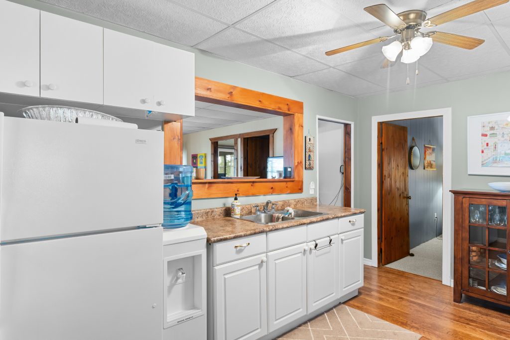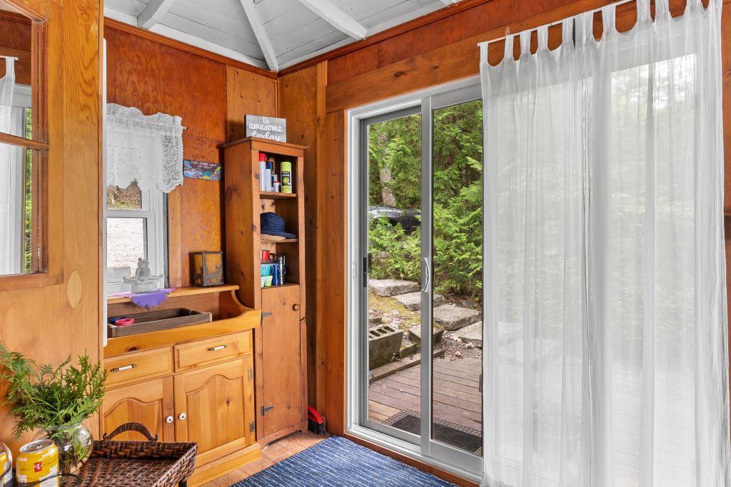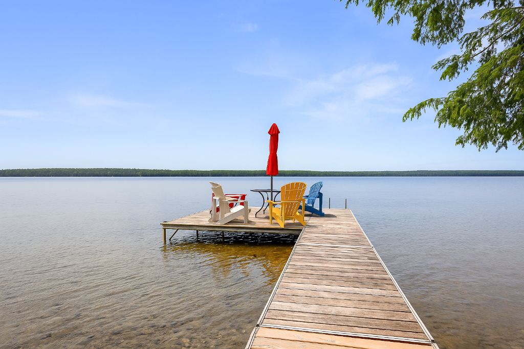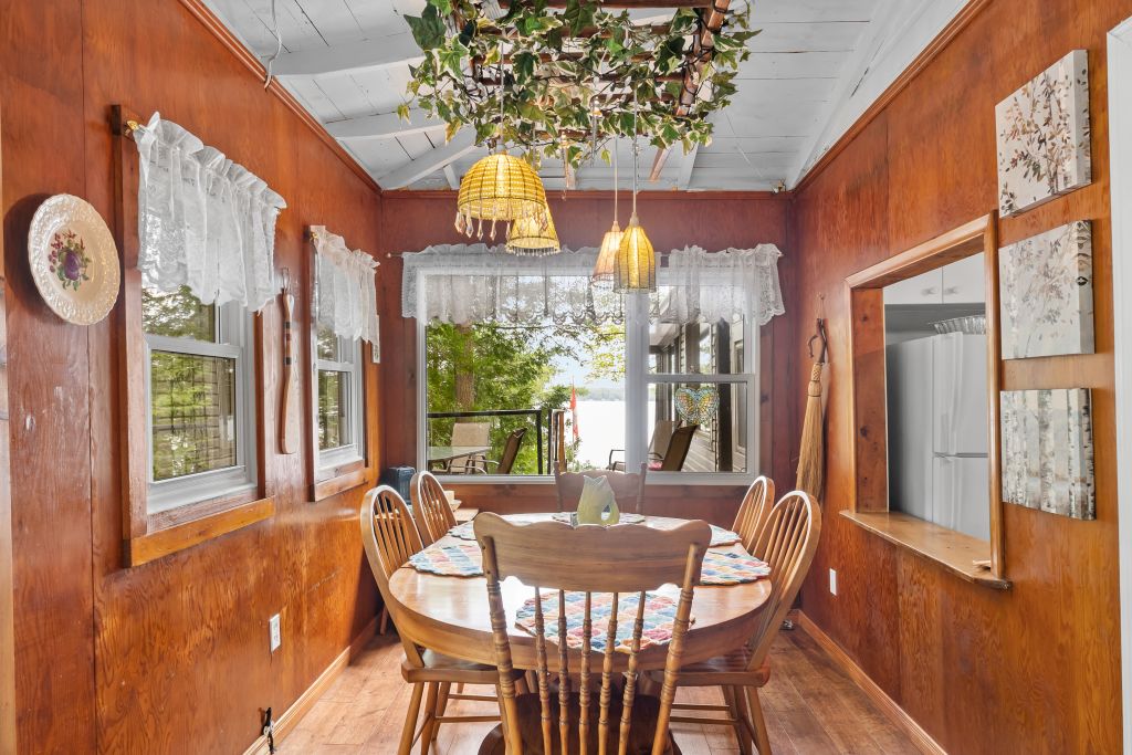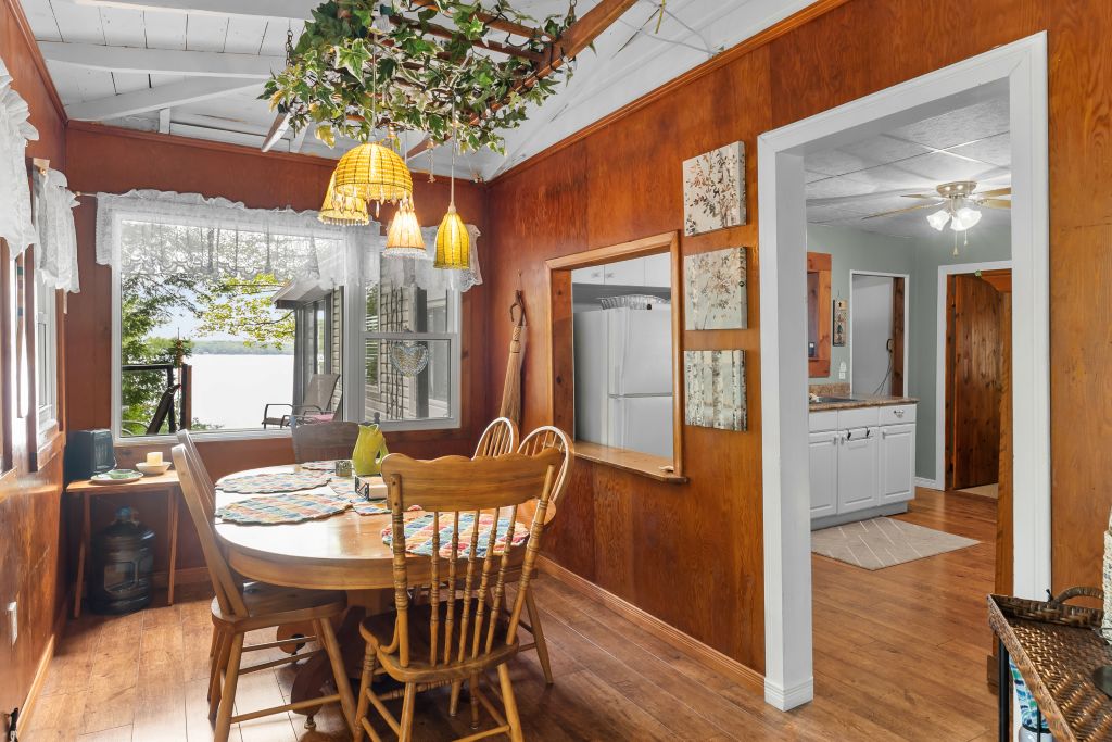 Four Mile Lake Million Dollar Sunsets and Crystal Clear Waterfront. Enjoy the well maintained 3 season cottage with a sunroom, a walkout to deck with glass railings overlooking the lake. The cottage has a generous footprint with 3 bedrooms, a full bathroom, a living room with propane fireplace, a kitchen with pass-through window to living room creating and open airy feel, and a dining room. Update with durable materials, including vinyl siding, newer windows, and a steel roof for long-lasting protection and style. For additional guests there’s a decent Bunkie that sleeps up to 4 extra visitors.